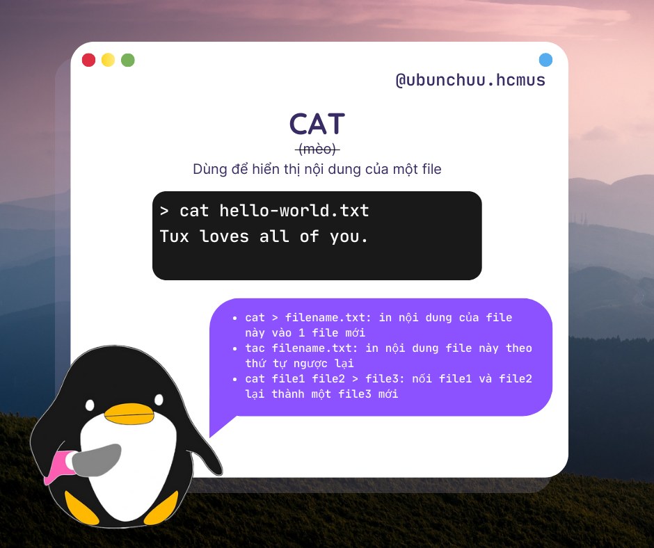 cat > filename.txt: in nội dung của file này vào 1 file mới.cat filename1.txt filename2.txt > filename3.txt: lấy ra output củafilename1.txtvàfilename2.txt, nối chúng lại rồi đưa vào một file mới làfilename3.txt.tac filename.txt: in nội dung file này theo thứ tự ngược lại.