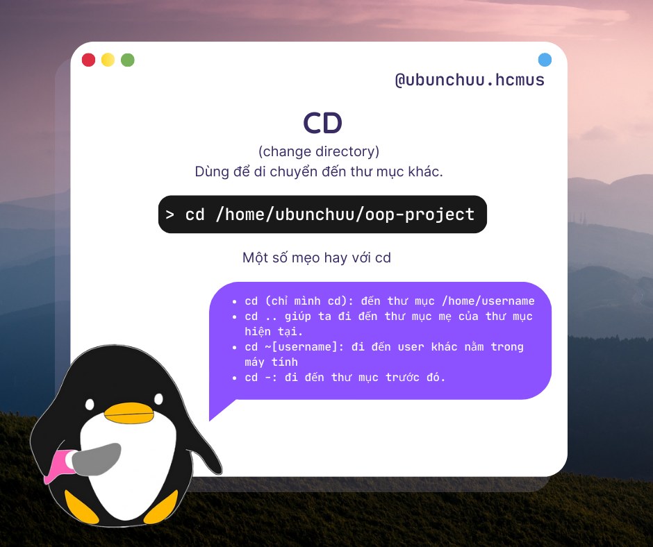 cd: gõ chỉ mình lệnhcdgiúp ta chuyển nhanh đến thư mục/home/usernamehiện tại mà không cần phải ghi địa chỉ ra.cd ..: giúp ta đi đến thư mục mẹ của thư mục hiện tại.cd ~[username]: giúp ta đi đến user khác nằm trong máy tính Linux.cd -: đi đến thư mục trước đó.
