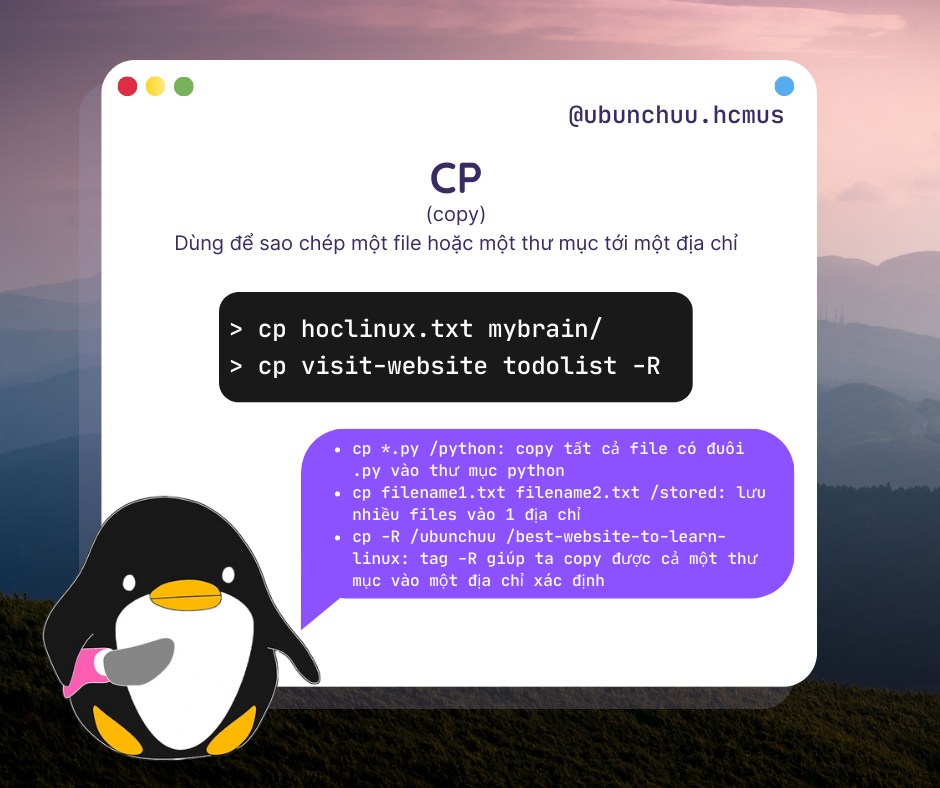 cp *.py /python: copy tất cả file có đuôi .py vào thư mục pythoncp filename1.txt filename2.txt /stored: lưu nhiều files vào 1 địa chỉ, điều kiện là các files phải ở trong cùng thư mục đangcdvào.cp -R /ubunchuu /best-website-to-learn-linux: tag-Rgiúp ta copy được cả một thư mục vào một địa chỉ xác định.