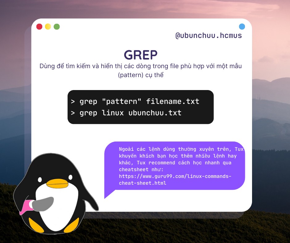 grep linux ubunchuu.txt # hiển thị ra những dòng có linux trong file.