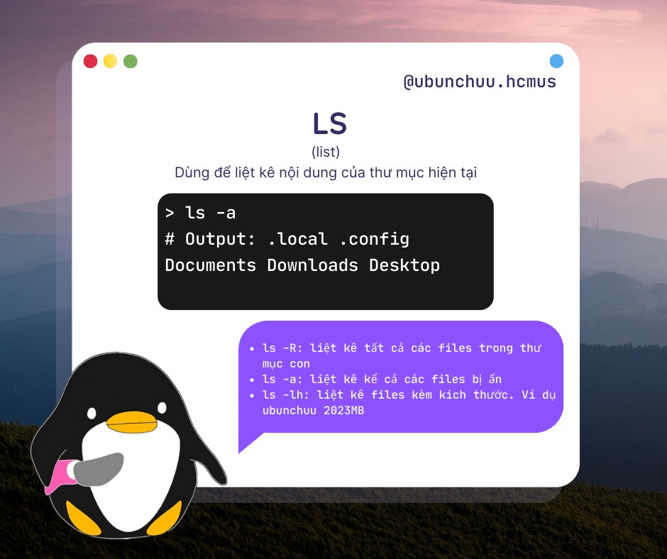 ls -R: liệt kê tất cả files bên trong mọi thư mục con.ls -a: hiện ra tất cả files kể cả files đang bị ẩn (hidden).ls -lh: hiên ra files kèm kích thước của files ví dụ nhưubunchuu 2022MB.