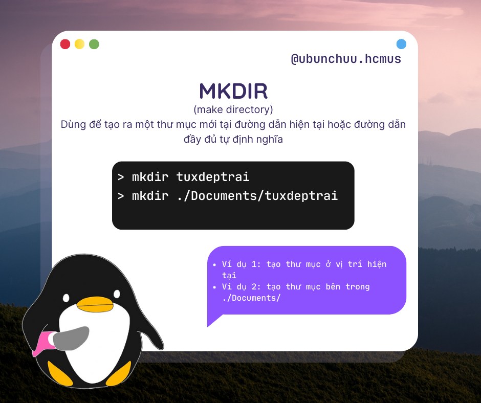 mkdir ubunchuu-vip #tạo thư mục tên ubunchuu bên trong thư mục hiện tại