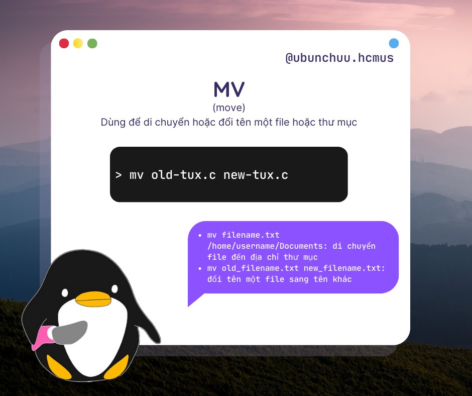 mv filename.txt /home/username/Documents: di chuyển file đến địa chỉ thư mục.mv old_filename.txt new_filename.txt: đổi tên một file sang tên khác.