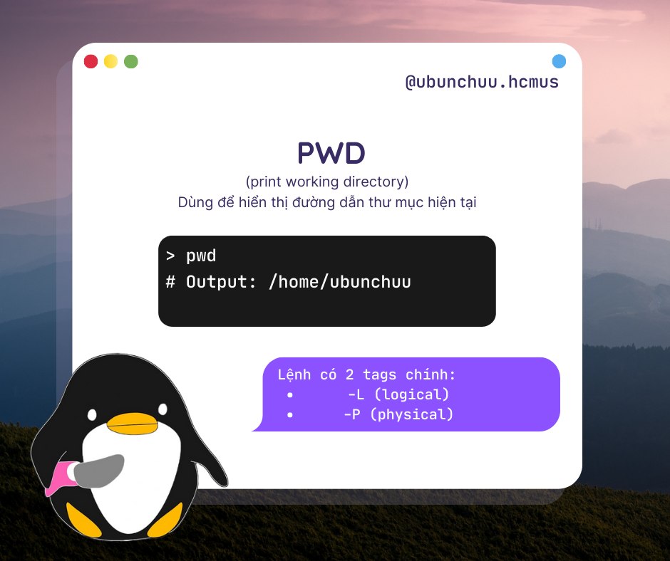 Lệnh pwd (print working directory) dùng để hiển thị đường dẫn thư mục hiện tại. Mặc định khi chưa thực hiện thao tác "đổi thư mục" thì khi chúng ta mới mở Terminal lên, chúng ta sẽ đang ở thư mục /home/username.