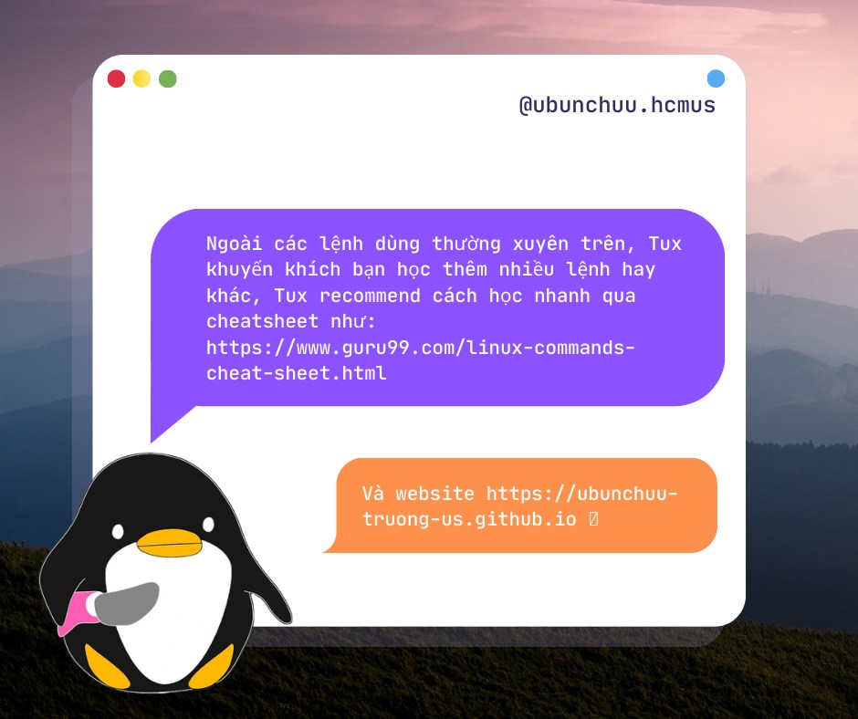 Ngoài các lệnh dùng thường xuyên trên, Ubunchuu khuyến khích các bạn nên học thêm nhiều lệnh hay khác, Ubunchuu recommend cách học nhanh qua cheatsheet như: https://www.guru99.com/linux-commands-cheat-sheet.html
