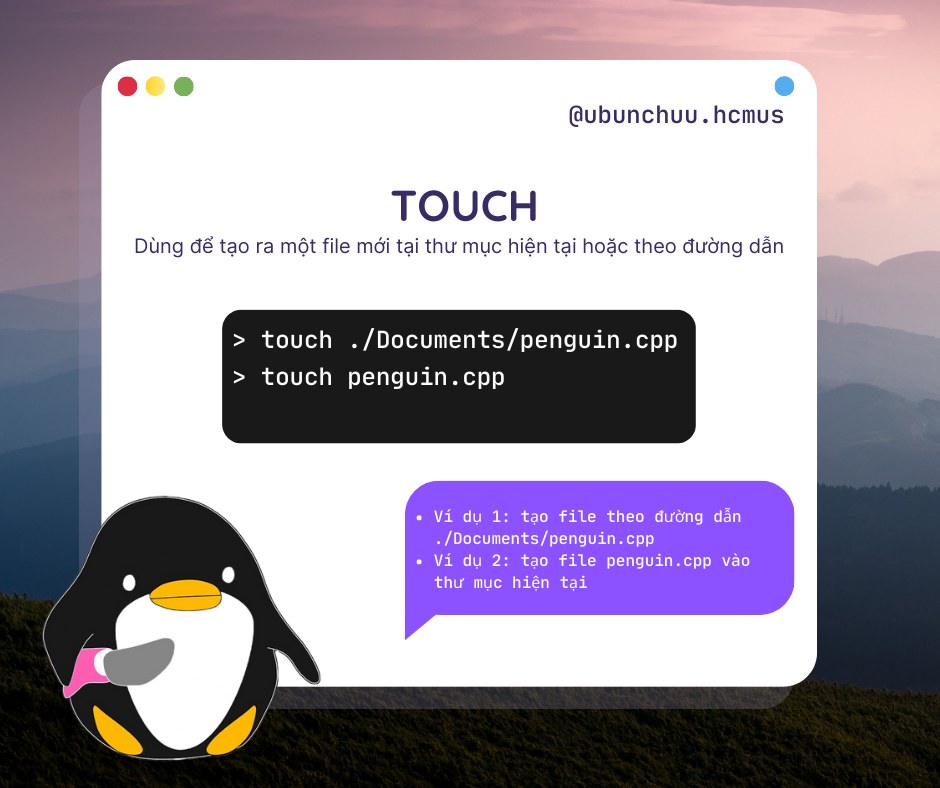 touch /home/ubunchuu/document/penguin.cpp # tạo file vào đường dẫn này