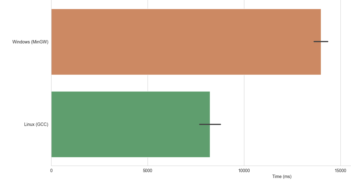 Tốc độ compile, debug bằng các ngôn ngữ lập trình trên Linux nhanh hơn nhiều so với các hệ điều hành khác. Thích hợp hoàn hảo dành cho dân code chính hiệu. Ảnh dưới so sánh tốc độ compile một file C++ 1000 dòng code, sample size = 1000 lần.
